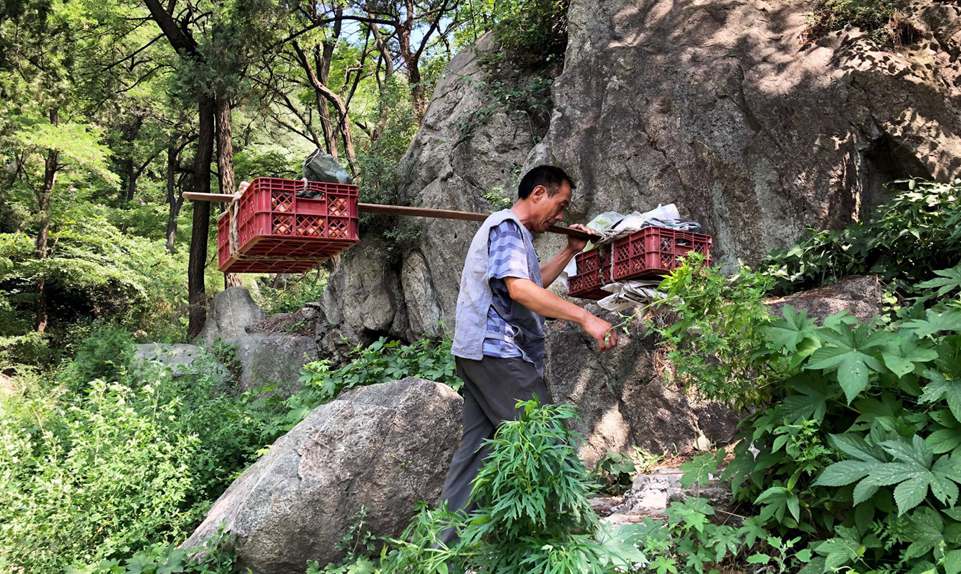 Geng Yukui, a lean 53-year-old man with a permanent tan, slogs up the long path to the mountain peak. Under a shoulder pole laden with eggs and vegetables exceeding 100 pounds, Geng traverses the 6,000 steps, one by one, to deliver goods to the restaurants and hotels which line the summit of Mount Tai, one of China's five most sacred mountains.