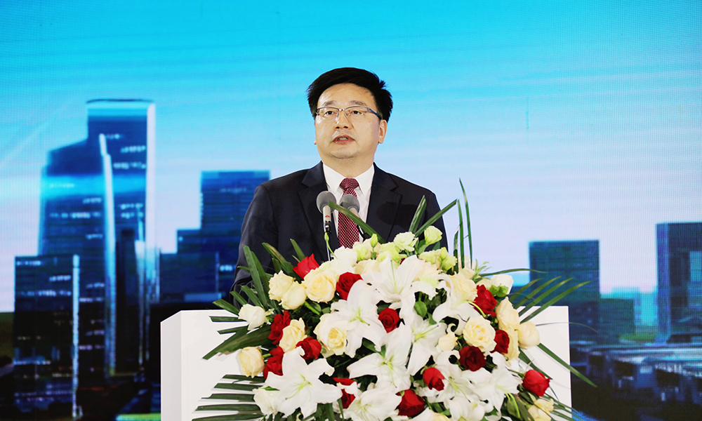 Han Liming, mayor of the Nanjing Municipal People's Government, delivers a speech at the Conference on Promoting the Construction of Manufacturing High-quality Development Pilot Zone in Lishui, Nanjing, March 24, 2020. (Photo/Geng Zhichao)