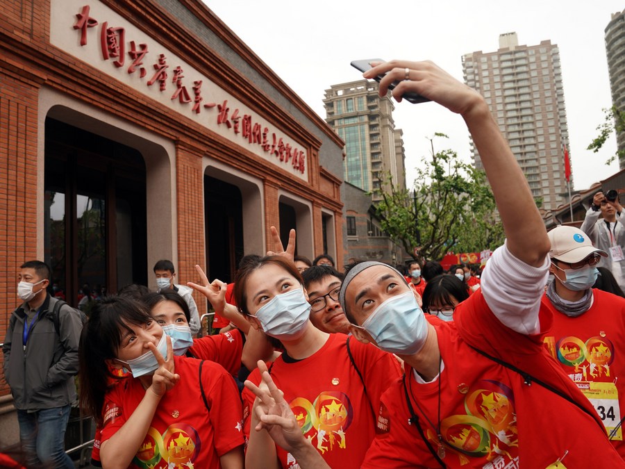 Photo taken on May 4, 2021 shows young people taking a selfie in front of the memorial of the first National Congress of the Communist Party of China …[More]