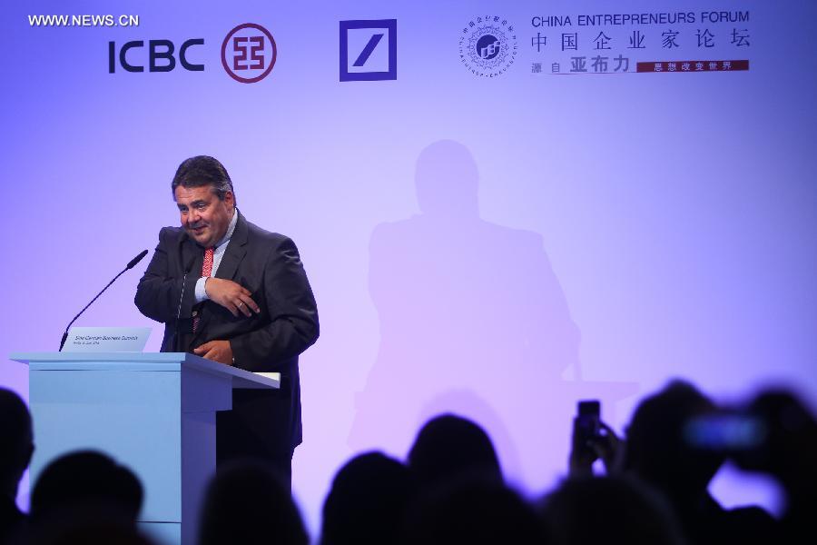 German Vice Chancellor and Economy and Energy Minister Sigmar Gabriel speaks during the 2014 Sino German Business Summit in Berlin, Germany, on June 4, 2014. (Xinhua/Zhang Fan)
