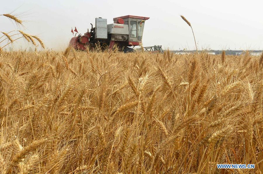 | A combine harvester works in a wheat field in Huzhuang Village under Yuanyang County, central China's Henan Province, June 3, 2014. Harvest work is in progress amid wheat fields in Henan, a major producing area of the crop. (Xinhua/Wang Song) |