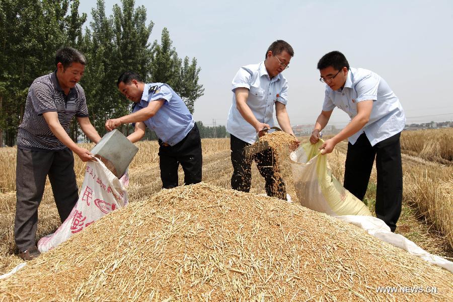 Local law court volunteers help a farmer pack harvested wheat crop in Songzhuang Village under Shuiguo Town of Zaozhuang, east China's Shandong Province, June 4, 2014. Summer wheat harvest has begun in Shandong, a major producing area of the crop. (Xinhua/Sun Zhongzhe)