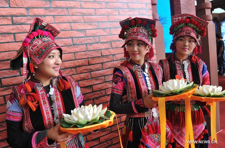 Girls from an ethnic group are seen in the opening ceremony of the 2nd China-South Asia Expo in Kunming, capital of southwest China's Yunnan Province, June 6, 2014. Over 1,000 enterprises from 46 countries and regions took part in the expo which will last till June 10. (Xinhua/Lin Yiguang)