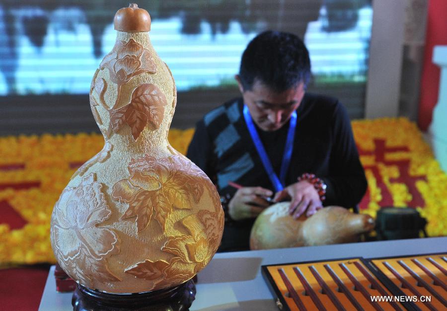 An exhibitor demonstrates carving skills on gourds during the 2nd China-South Asia Expo in Kunming, capital of southwest China's Yunnan Province, June 6, 2014. Over 1,000 enterprises from 46 countries and regions took part in the expo which will last till June 10. (Xinhua/Lin Yiguang)