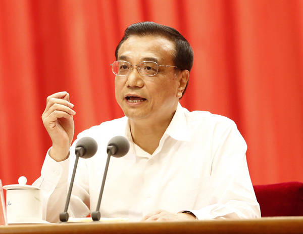 Premier Li Keqiang addresses a conference of the Chinese Academy of Sciences and the Chinese Academy of Engineering in Beijing on Tuesday. [Feng Yongbin / China Daily]