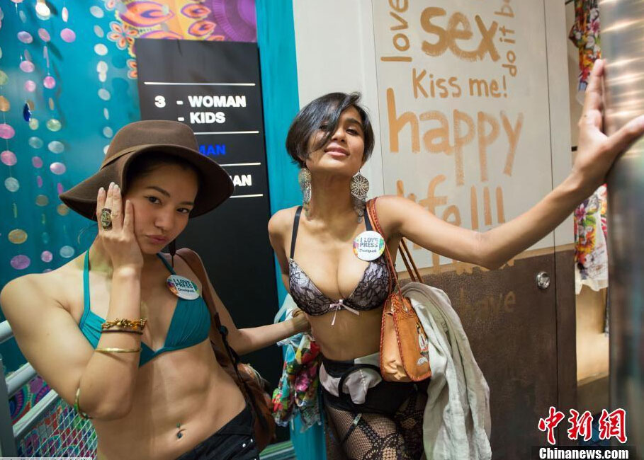 The picture published on Tuesday June 24, 2014, shows that shoppers wearing colorful swimwear in Tokyo, Japan, pose for a picture at a local store, which has promised that the first 100 consumers who shopped there bedecked in swimwear would be given certain products, free of charge, as part of a promotion. [Photo: Chinanews.com]