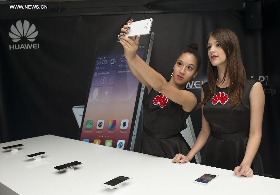 | Staff members take a selfie with Huawei Ascend P7 smartphone during a presentation in Zagreb, Croatia, July 3, 2014. Huawei launched new flagship smartphone Ascend P7 in Zagreb on Thursday. (Xinhua/Miso Lisanin) |