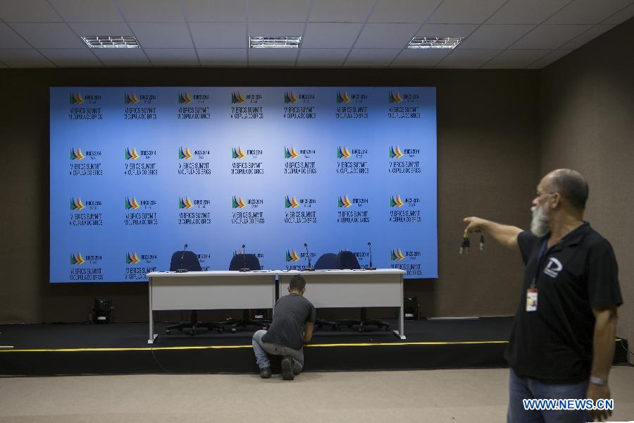 Staff members work at one of the press conference rooms of the Center for Events of Estado Ceara in Fortaleza, Brazil, July 13, 2014. The sixth BRICS Summit will be held here on July 15, 2014. (Xinhua/Xu Zijian)