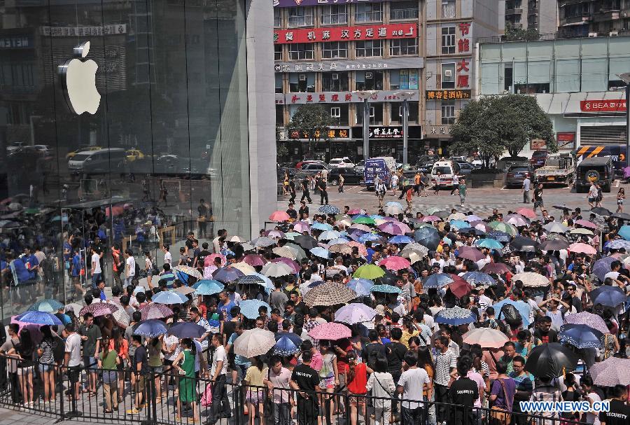 Customers wait outside a new Apple Store in Jiangbei District of southwest China's Chongqing, July 26, 2014. Chongqing's first Apple Store went into business on Saturday. (Xinhua/Chen Cheng)