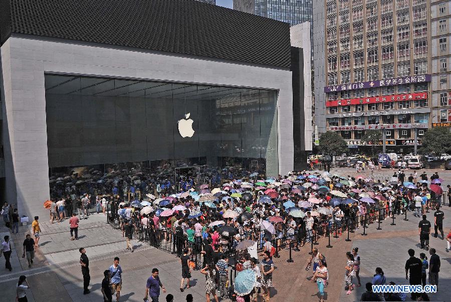 Customers wait outside a new Apple Store in Jiangbei District of southwest China's Chongqing, July 26, 2014. Chongqing's first Apple Store went into business on Saturday. (Xinhua/Chen Cheng)