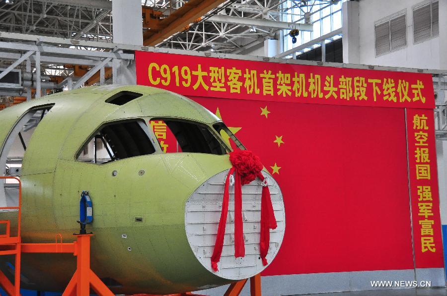 The nose section of C919 plane is seen during an inauguration in Chengdu, capital of southwest China's Sichuan Province, July 31, 2014. China's plane maker AVIC Chengdu Aircraft Industrial Co. Ltd. Thursday announced that the nose section of its C919 plane, the country's homemade large passenger aircraft, has rolled off the production line. (Xinhua)