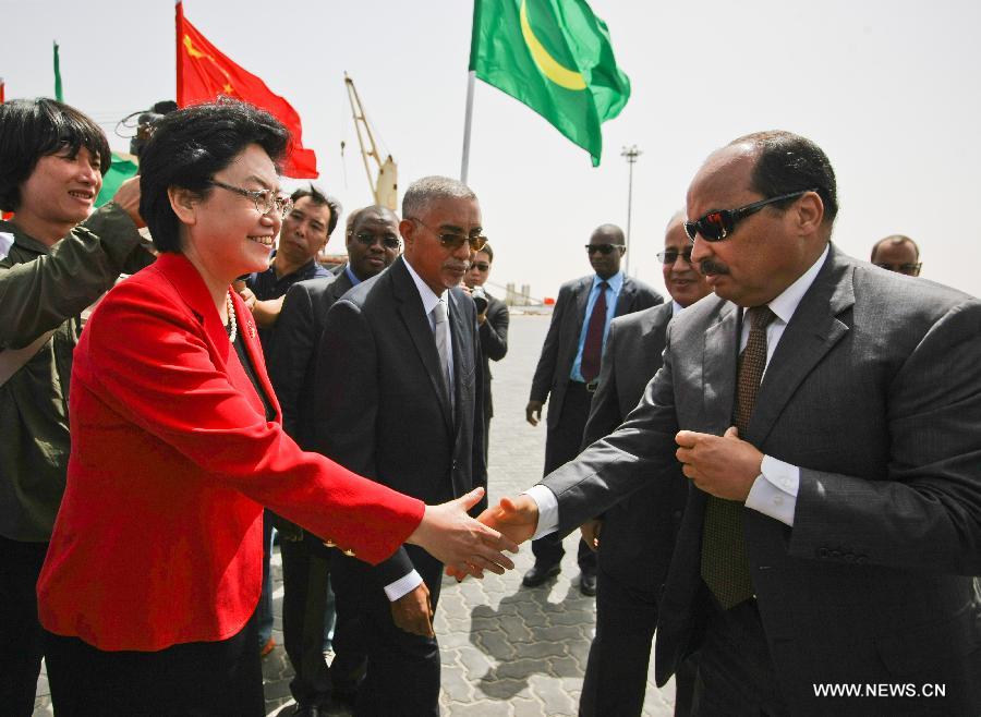 | Li Bin (L, front), Chinese President Xi Jinping's special envoy and head of the National Population and Family Planning Commission, shakes hands with Mauritanian President Mohamed Ould Abdel Aziz while attending the completion ceremony of the Port Autonome of Nouakchott, known as the Port of Amitie, in Nouakchott, capital of Mauritania, Aug. 3, 2014. The first three berths of the port were constructed by China from 1979 to 1986 as the second biggest project among China's assistance constructions in Africa. With the completion of Berth 4 and 5 in July, the port is expected to reach a throughput capacity of four million tonnes, nearly 90 percent of the import transportation of the whole country. (Xinhua/Li Jing) |