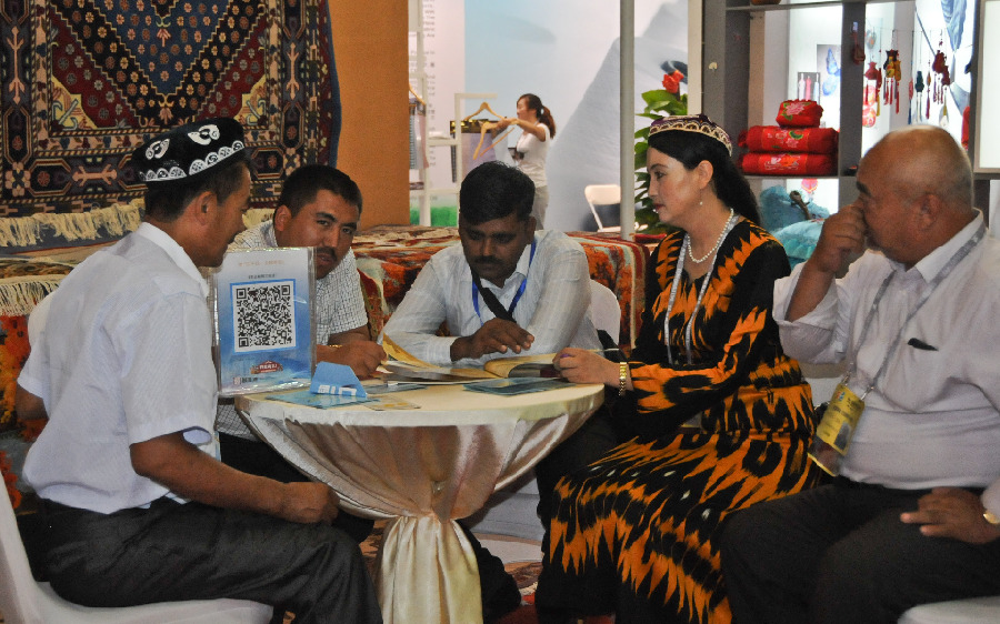 Exhibitors and visitors discuss at China-Eurasia Expo on Sept.3. (Xinhuanet/Yan Ting)