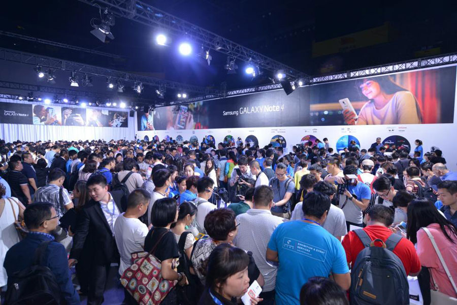 People try the new Galaxy Note series and related products after the Beijing launch event on September 3rd, 2014.[Photo: CRIENGLISH.com/Wang Mengzhen]