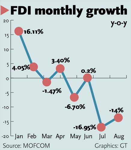 Figures released by MOFCOM Tuesday show that foreign direct investment (FDI) into non-financial sectors in August was $7.2 billion, down 14 percent over the same period last year.