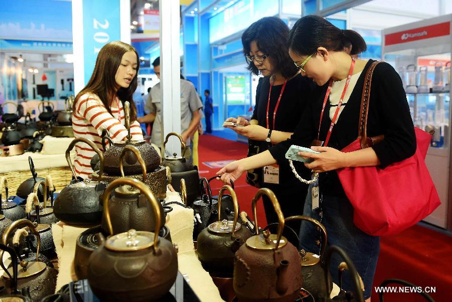 Customers look at Cambodian handmade teapots during the 11th China-ASEAN Expo (CAEXPO) in Nanning, capital of south China's Guangxi Zhuang Autonomous Region, Sept. 17, 2014. The 11th CAEXPO will be held here from Sept. 16 to 19. CAEXPO takes place annually in Nanning and is expected to promote free trade between China and the ASEAN countries. (Xinhua/Zhang Ailin)