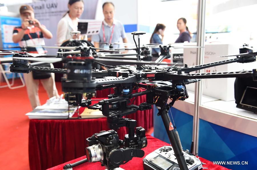 A camera-carrying unmanned aerial vehicle (UAV) is diaplayed during the 11th China-ASEAN Expo in Nanning, capital of south China's Guangxi Zhuang Autonomous Region, Sept. 17, 2014. New energy and high tech equipments attracted both exhibitors and visitors from home and abroad during the 11th CAEXPO held in Nanning from Sept. 16 to 19. CAEXPO takes place annually in Nanning and is expected to promote free trade between China and the ASEAN countries. (Xinhua/Zhou Hua)