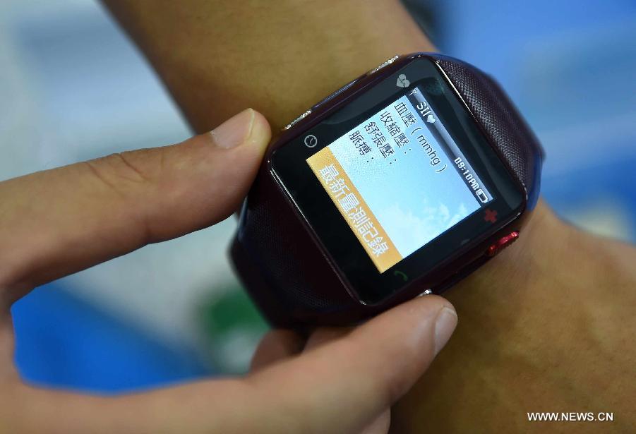 A Chinese exhibitor demonstrates a smart watch designed for elderly users during the 11th China-ASEAN Expo in Nanning, capital of south China's Guangxi Zhuang Autonomous Region, Sept. 17, 2014. New energy and high tech equipments attracted both exhibitors and visitors from home and abroad during the 11th CAEXPO held in Nanning from Sept. 16 to 19. CAEXPO takes place annually in Nanning and is expected to promote free trade between China and the ASEAN countries. (Xinhua/Huang Xiaobang)