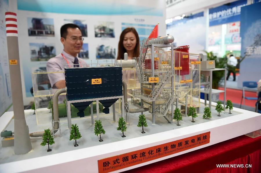 A Chinese exhibitor (L) introduces a biomass power generation system to a visitor during the 11th China-ASEAN Expo in Nanning, capital of south China's Guangxi Zhuang Autonomous Region, Sept. 17, 2014. New energy and high tech equipments attracted both exhibitors and visitors from home and abroad during the 11th CAEXPO held in Nanning from Sept. 16 to 19. CAEXPO takes place annually in Nanning and is expected to promote free trade between China and the ASEAN countries. (Xinhua/Huang Xiaobang)