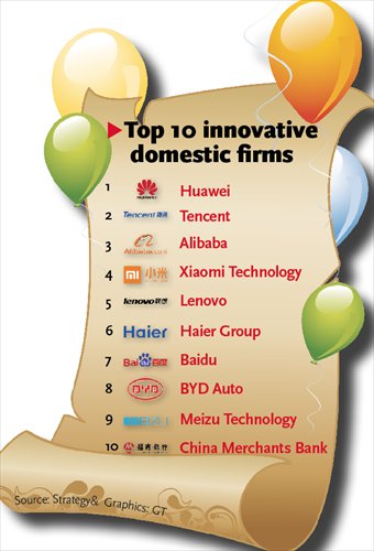 Smartphone vendors Beijing Xiaomi Technology Co, Meizu Technology Co, and electric-car maker BYD Co are new to the list of domestic innovators, among which, eight of the top 10 firms are in the high-tech or Internet arena, the report said, attributing the phenomenon in part to the highly open and intensely competitive nature of the sectors in the mainland market.