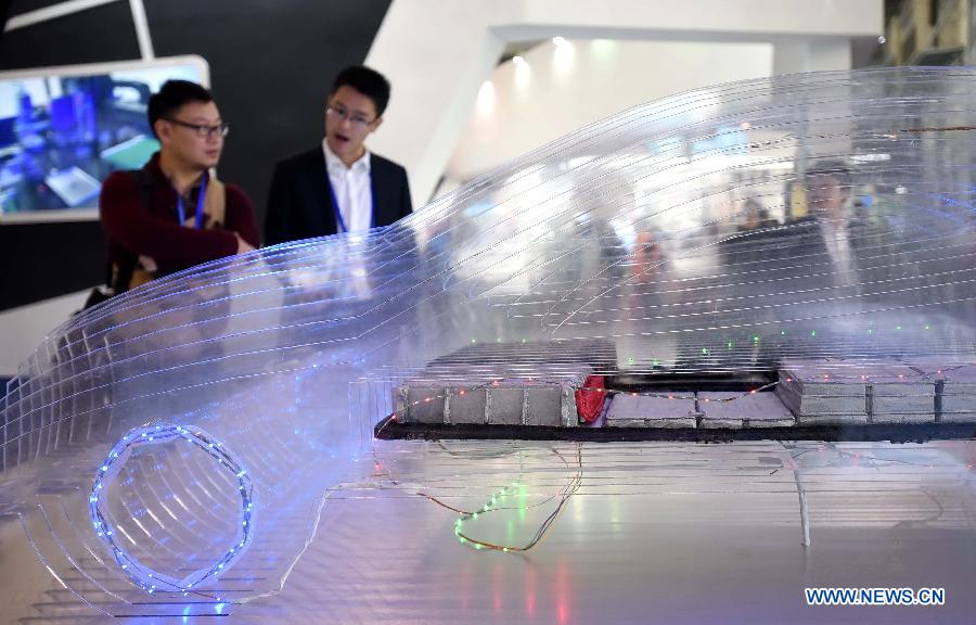 Visitors view the model of charging equipment for an electric vehicle at the 15th Western China International Fair (WCIF) in Chengdu, capital of southwest China's Sichuan Province, Oct. 23, 2014. Over 9,000 exhibitors from 76 countries and regions took part in the WCIF, which opened here Thursday. (Xinhua/Xue Yubin)