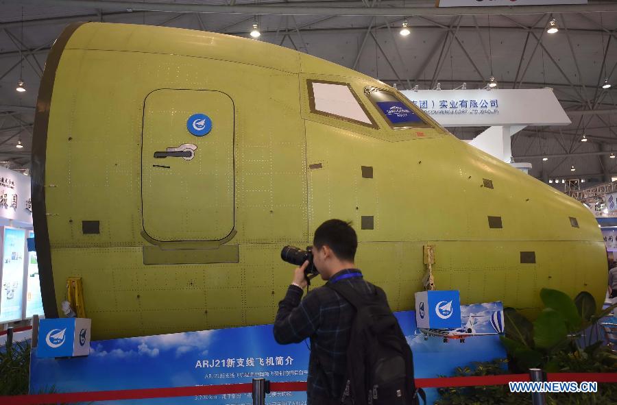 A visitor takes photos of an aircraft at the 15th Western China International Fair (WCIF) in Chengdu, capital of southwest China's Sichuan Province, Oct. 23, 2014. Over 9,000 exhibitors from 76 countries and regions took part in the WCIF, which opened here Thursday. (Xinhua/Xue Yubin)