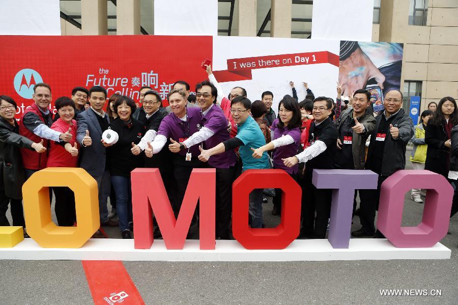 Employees pose for a group photo in front of the "HELLO MOTO" installation during a celebration of Lenovo's acquisition of Motorola Mobility in Beijing, China, Oct. 31, 2014. Lenovo Group, the world's biggest personal computer maker, said on Oct. 30 it has fully acquired Motorola's mobile business, making Lenovo world's third largest smartphone maker. In the 2.9 billion U.S.dollar deal, Lenovo took over the Motorola brand and Motorola's portfolio of innovative smartphones like Moto X, Moto G and Moto E series, as well as the future Motorola product roadmap, said Lenovo. (Xinhua/Shen Bohan)