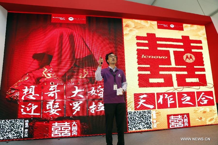 Zhang Hui, general manager of Lenovo MBG mobile phone business in China, addresses the celebration of Lenovo's acquisition of Motorola Mobility in Beijing, China, Oct. 31, 2014. Lenovo Group, the world's biggest personal computer maker, said on Oct. 30 it has fully acquired Motorola's mobile business, making Lenovo world's third largest smartphone maker. In the 2.9 billion U.S.dollar deal, Lenovo took over the Motorola brand and Motorola's portfolio of innovative smartphones like Moto X, Moto G and Moto E series, as well as the future Motorola product roadmap, said Lenovo. (Xinhua/Shen Bohan)