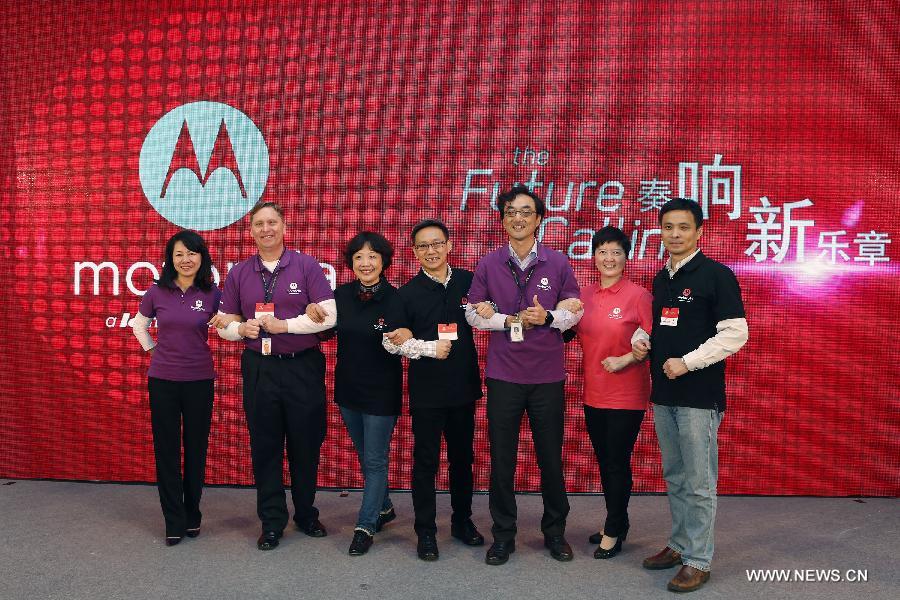A celebration is held to mark Lenovo's acquisition of Motorola Mobility in Beijing, China, Oct. 31, 2014. Lenovo Group, the world's biggest personal computer maker, said on Oct. 30 it has fully acquired Motorola's mobile business, making Lenovo world's third largest smartphone maker. In the 2.9 billion U.S.dollar deal, Lenovo took over the Motorola brand and Motorola's portfolio of innovative smartphones like Moto X, Moto G and Moto E series, as well as the future Motorola product roadmap, said Lenovo. (Xinhua/Shen Bohan)