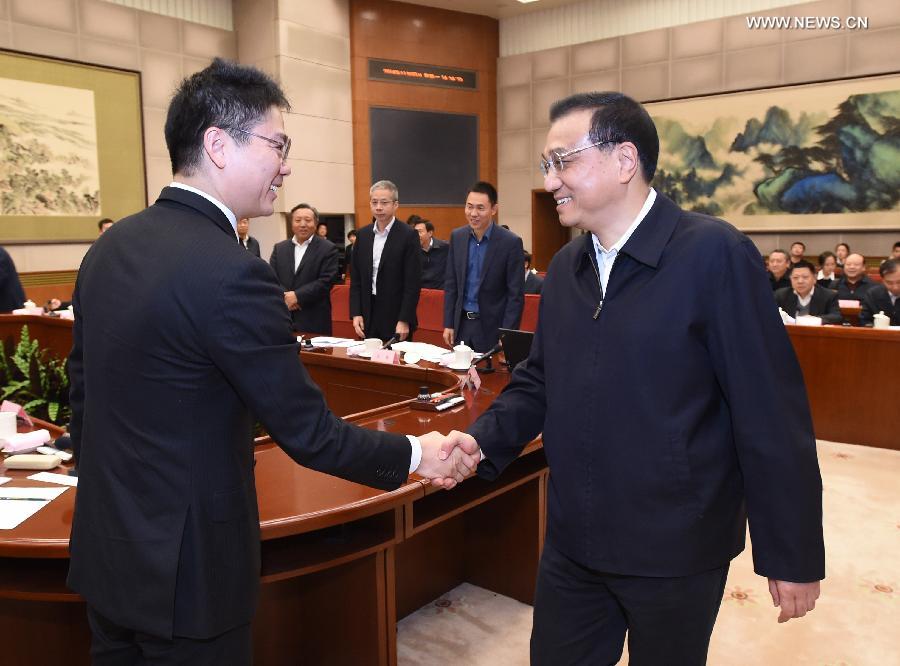 | Chinese Premier Li Keqiang (R) shakes hands with a participant during a meeting on the economic situation in Beijing, capital of China, Nov. 3, 2014. Li Keqiang presided over a meeting with representatives from research institutes and companies on the economic situation in Beijing Monday. (Xinhua/Ma Zhancheng) |