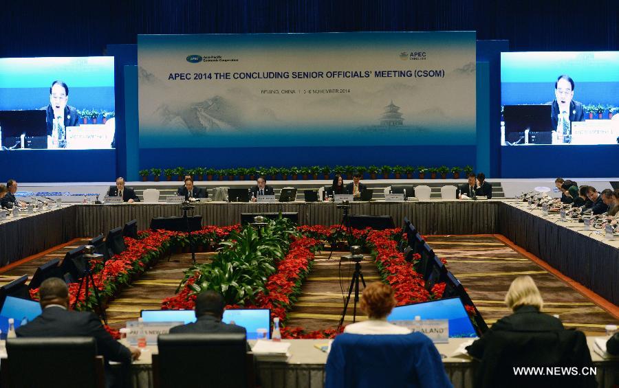 The Asia-Pacific Economic Cooperation (APEC) 2014 Concluding Senior Officials Meeting (CSOM) is held at China National Convention Center in Beijing, capital of China, Nov. 5, 2014. The APEC 2014 CSOM will be held here from Nov. 5 to 6. (Xinhua/Ma Ning)