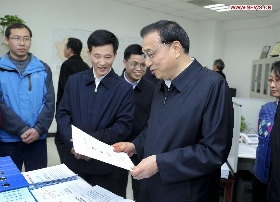 Chinese Premier Li Keqiang asks about the task of rural drinking water safety during his visit to the Ministry of Water Resources in Beijing, capital of China, Nov. 24, 2014. Li Keqiang made an inspection tour of the Ministry of Water Resources in Beijing on Monday. (Xinhua/Zhang Duo)
