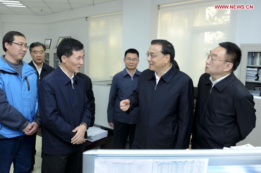 | Chinese Premier Li Keqiang talks with staffs during his visit to the Ministry of Water Resources in Beijing, capital of China, Nov. 24, 2014. Li Keqiang made an inspection tour of the Ministry of Water Resources in Beijing on Monday. (Xinhua/Zhang Duo) |