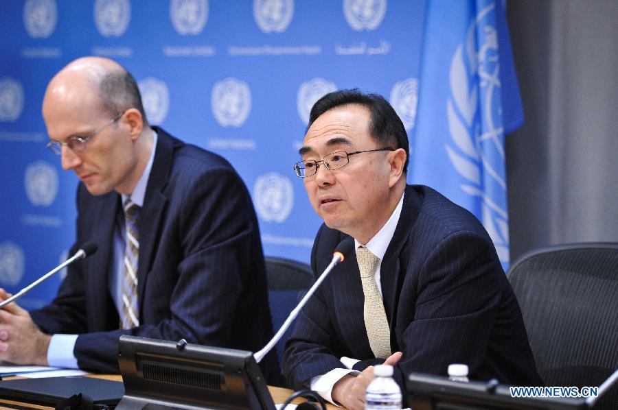 Pingfan Hong(R), Director of the Development and Policy Analysis Division for the UN Department of Economic and Social Affairs, speaks during a press conference to preview the World Economic Situation and Prospects 2015 report, at the UN headquarters in New York, on Dec. 10, 2014. Global economic growth is forecast to increase marginally over the next two years, but mounting uncertainties could undermine the growth, said a UN report launched Wednesday. (Xinhua/Niu Xiaolei)