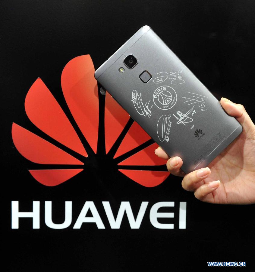 A Huawei Ascend Mate 7 smart phone of the Paris Saint-Germain (PSG) edition is displayed during the launching ceremony in Paris, France, Dec. 16, 2014. China's leading telecom equipment manufacturer Huawei launched a limited edition of Ascend Mate 7 smart phone with the signatures of 5 PSG players. (Xinhua/Chen Xiaowei)