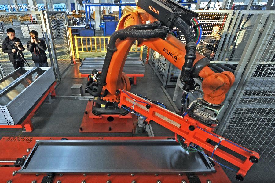 Staff members take pictures of technological process of the welding production line at an elevator company in the Nanxun District of Huzhou City, east China's Zhejiang Province, Dec. 25, 2014. In order to break out the bottleneck of economic development, a series of technical transformation was launched in traditional manufacturing industry in the Nanxun District of Huzhou in 2014. (Xinhua/Tan Jin)