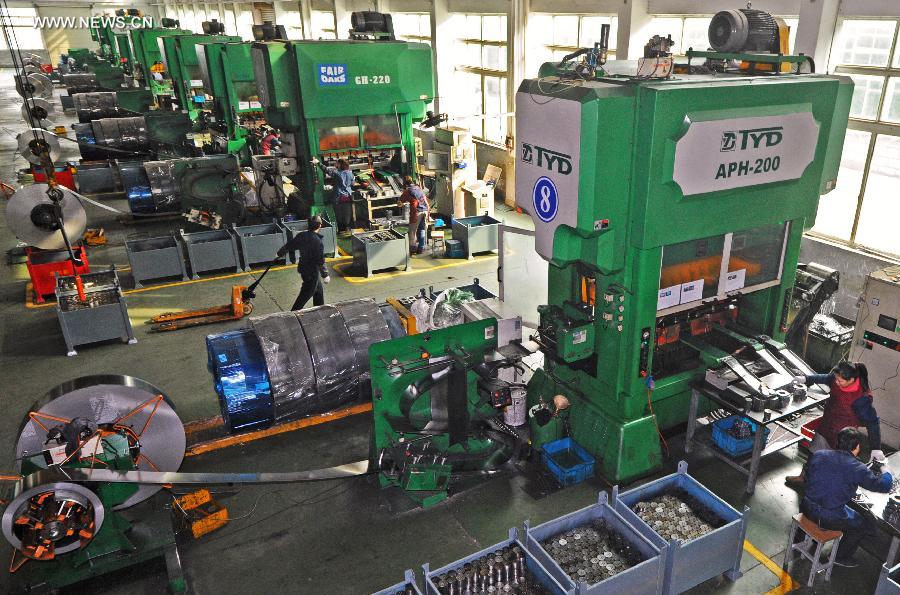 | Photo taken on Dec. 26, 2014 shows a numerically controlled lathe production line of an electric machine company in the Nanxun District of Huzhou City, east China's Zhejiang Province. In order to break out the bottleneck of economic development, a series of technical transformation was launched in traditional manufacturing industry in the Nanxun District of Huzhou in 2014. (Xinhua/Tan Jin) |