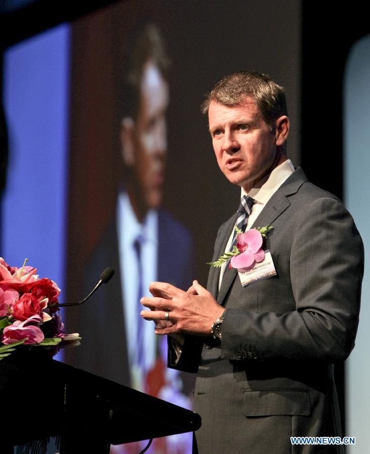 Australia's New South Wales state Premier Mike Baird speaks at the launching ceremony of Bank of China's Sydney RMB clearing bank in Sydney, Australia, Feb. 9, 2015. (Xinhua/Jin Linpeng)