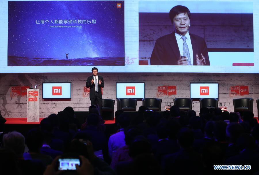 Lei Jun, CEO of Xiaomi Tech, speaks during a summit session of 2015 CeBIT Technology Trade fair in Hanover, Germany, on March 16, 2015. Top IT business fair CeBIT 2015, which features a strong Chinese presence, opened on Sunday in Germany. (Xinhua/Zhang Fan)