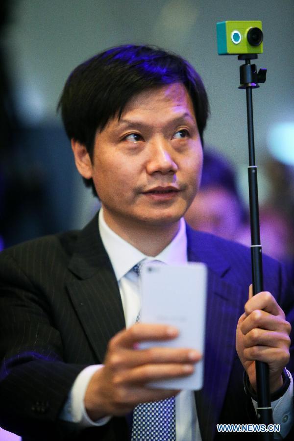 | Lei Jun, CEO of Xiaomi Tech, uses his cell phone and action camera during a summit session of 2015 CeBIT Technology Trade fair in Hanover, Germany, on March 16, 2015. Top IT business fair CeBIT 2015, which features a strong Chinese presence, opened on Sunday in Germany. (Xinhua/Zhang Fan) |