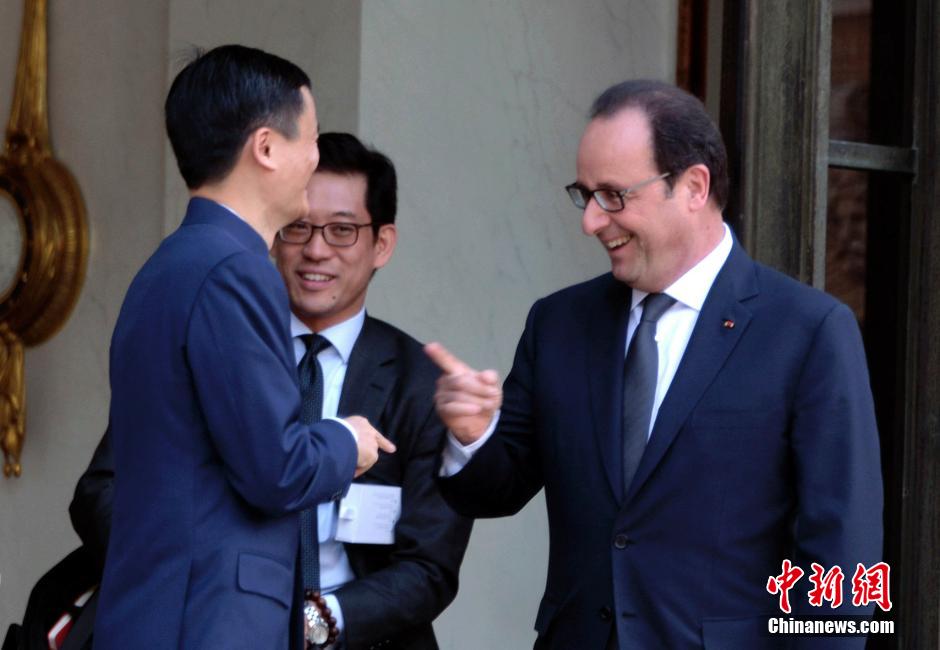 French President Francois Hollande (R) talks with Jack Ma, Chinese entrepreneur and founder of Alibaba Group, in Paris, France, on March 18, 2015. (Photo/Chinanews.com)