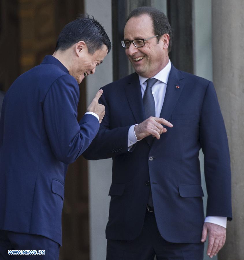 French President Francois Hollande (R) talks with Jack Ma, Chinese entrepreneur and founder of Alibaba Group, in Paris, France, on March 18, 2015.(Xinhua/Chen Xiaowei)