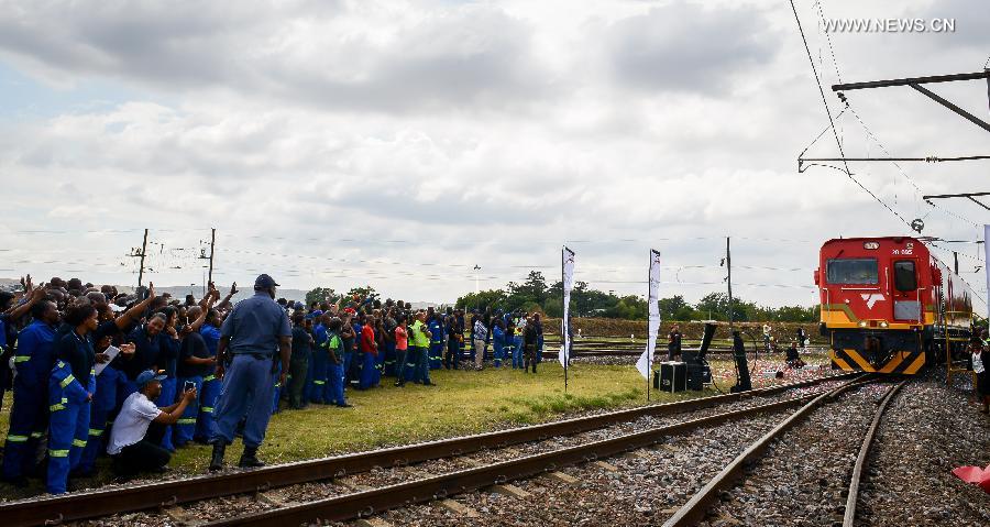 Photo taken on March 19, 2015 shows the ninety-fifth Chinese-made electric locomotive at the Transnet Engineering Koedoespoort Plant in Pretoria, South Africa. Ninety-five Chinese-made electric locomotives were delivered to South Africa on Thursday at a grand ceremony attended by South African President Jacob Zuma. South Africa's transport utility Transnet delivered the locomotives in collaboration with the Chinese Zhuzhou Electric Locomotives Company under the China Southern Locomotive and Rolling Stock Industry Group. (Xinhua/Zhai Jianlan)