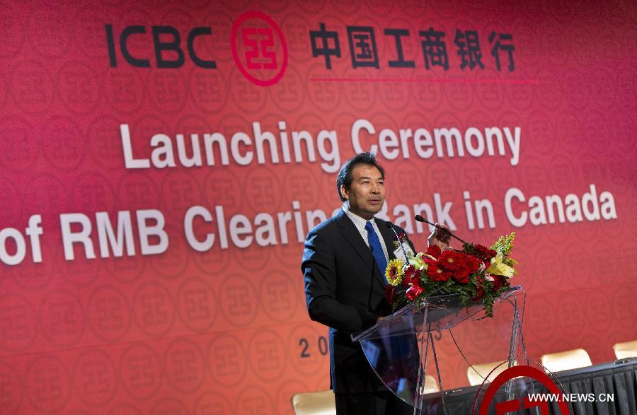 Chinese Ambassador to Canada Luo Zhaohui addresses the launching ceremony of China's ICBC RMB clearing bank in Canada, in Toronto March 23, 2015. ICBC Canada, a Renminbi clearing bank, was officially launched here on Monday, becoming the first RMB trading hub in North America. (Xinhua/Zou Zheng)
