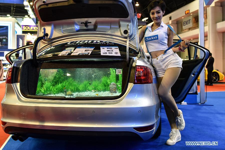 A model poses beside a car exhibited in the 36th Bangkok International Motor Show in Bangkok, March 25, 2015. The Bangkok International Motor Show will be held from March 25 to April 5. (Xinhua/Li Mangmang)
