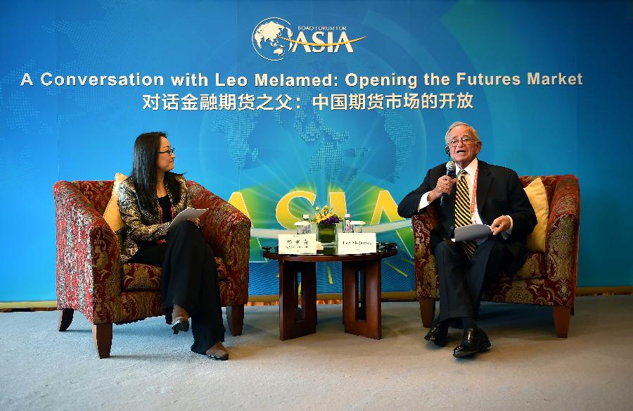 | Leo Melamed (R), chairman emeritus of Chicago Mercantile Exchange (CME) Group, talks with Yang Yanqing, deputy editor-in-chief of the China Business News, at a luncheon of "A Conversation with Leo Melamed: Opening the Futures Market" during the Boao Forum for Asia (BFA) Annual Conference 2015 in Boao, south China's Hainan Province, March 26, 2015. (Xinhua/Guo Cheng) |