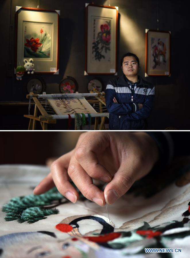 Combined photo taken on March 27, 2015 shows a portrait of Jiang Tongwan (upper) and a work of Hunan embroidery he made at a studio in Jinggang Ancient Town in Changsha, central China's Hunan Province. Jiang Tongwan, born in 1989, suffered from physical disability resulted from a disease in childhood. He was one of the first male graduates majored in Hunan embroidery. After graduation, he gave up the chance to work in enterprises the school recommended. Together with his classmate, Jiang rent a shop at Jinggang Ancient Town and sold their works. The sales volume of their studio last year reached over 100,000 yuan (about 16,140 U.S. dollars). (Xinhua/Li Ga)