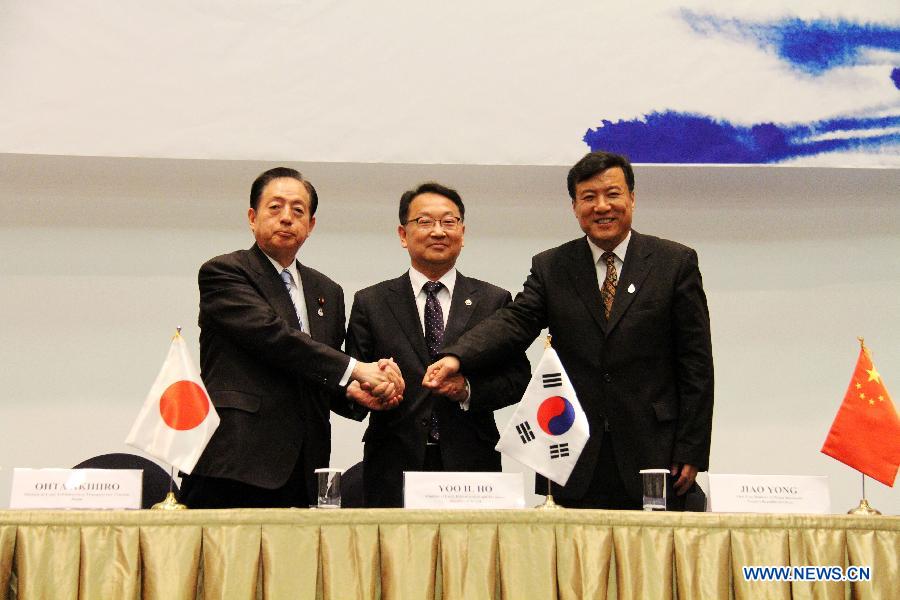 China's Vice Minister of Water Resources Jiao Yong, South Korea's Minister of Land, Infrastructure and Transport Yoo Il-ho and Japan's Minister of Land, Infrastructure, Transport and Tourism Ohta Akihiro (R-L) shake hands during a trilateral ministerial meeting at the seventh World Water Forum held in Gyeongju, South Korea, April 13, 2015. China, South Korea and Japan on Monday agreed to strengthen trilateral cooperation on water policy innovation during the seventh World Water Forum held in South Korea's southeastern cities of Daegu and Gyeongju. (Xinhua/Peng Qian)