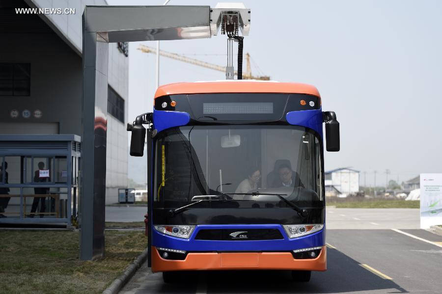 Photo taken on April 16, 2015 shows a 18-meter-long BRT with super capacitor at the Ningbo base of China South Railway (CRS) in Ningbo, east China's Zhejiang Province. Trolley buses with super capacitor featured high power start-up, quick charge and high recycling efficiency. They will be fully charged at a bus station within 30 seconds and running over 5 kilometers. The service life for such a trolley bus will last as long as 12 years. (Xinhua/Ju Huanzong)