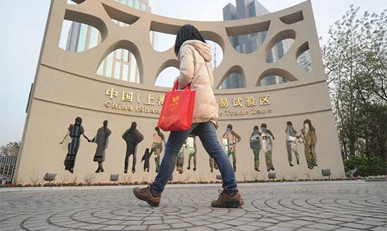 | A pedestrian walks past a signboard of the China (Shanghai) Pilot Free Trade Zone in Pudong..(File Photo) |